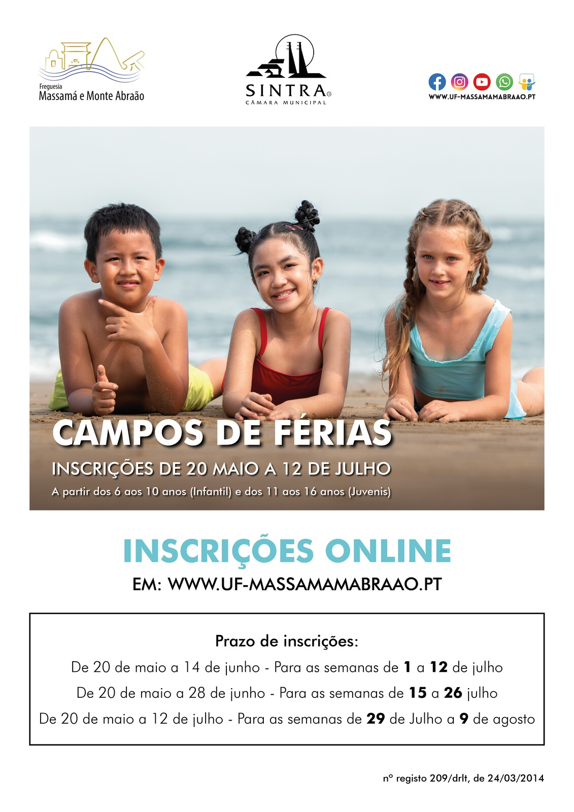 Os campos de férias iniciam dia 1 de julho e terminam dia 9 de agosto, as inscrições são realizadas por semana, exclusivamente online, ou nos balcões de atendimento da junta de freguesia, das 09h00 às 13h00 e das 14h00 às 16h30.