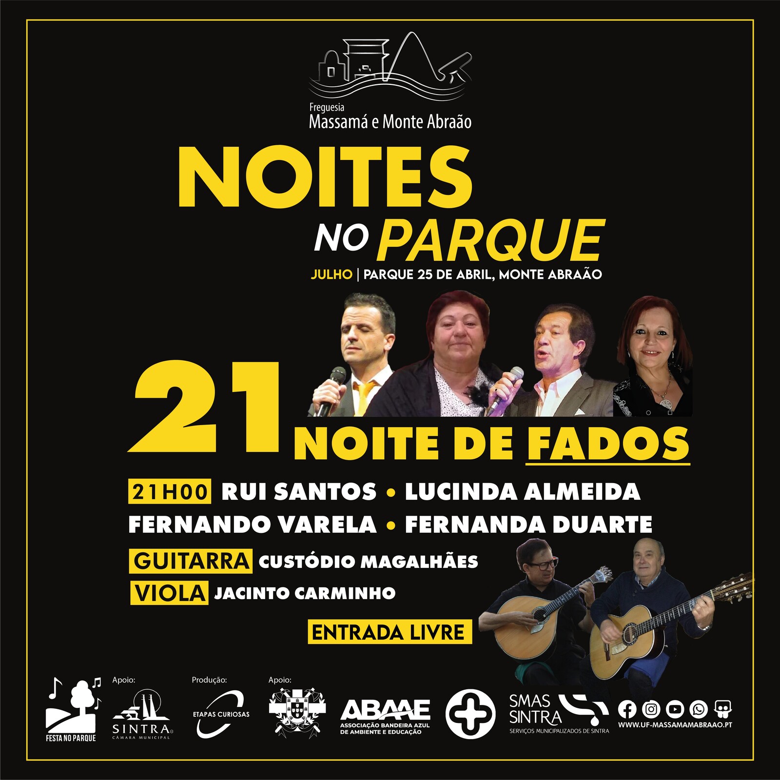 - 21 de julho | 21h00 - Noite de Fados com Rui Santos, Lucinda Almeida, Fernando Varela e Fernanda Duarte. Acompanhados na guitarra por Custódio Magalhães e na viola por Jacinto Carminho