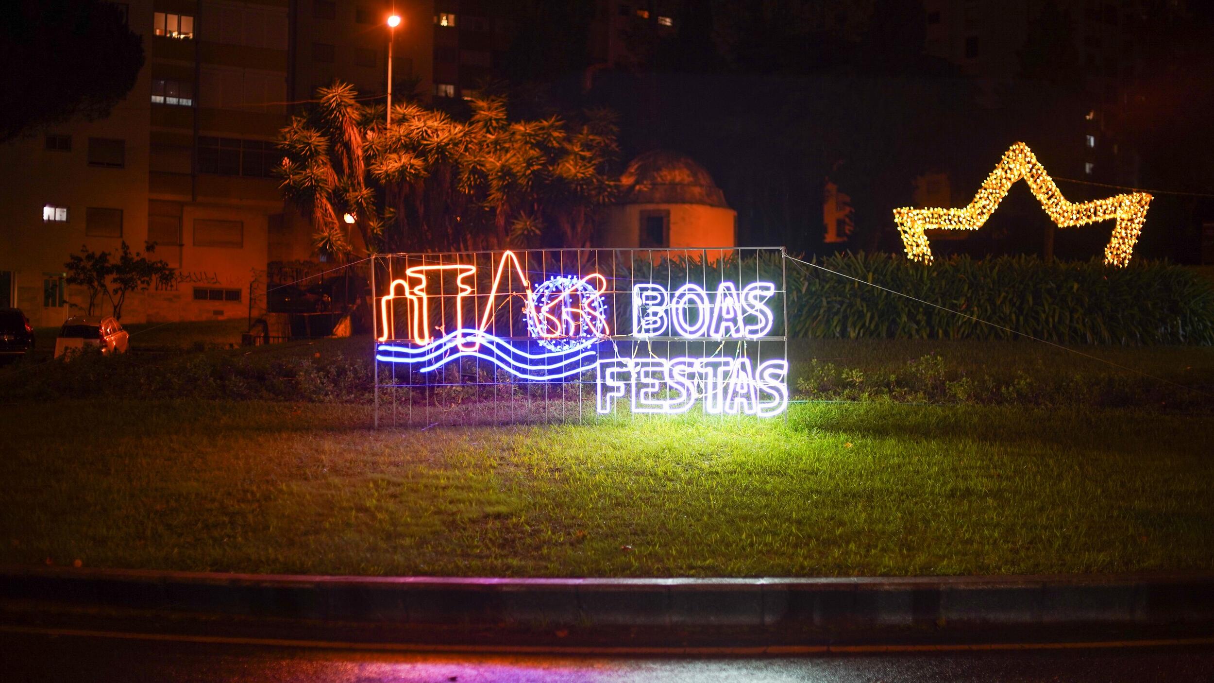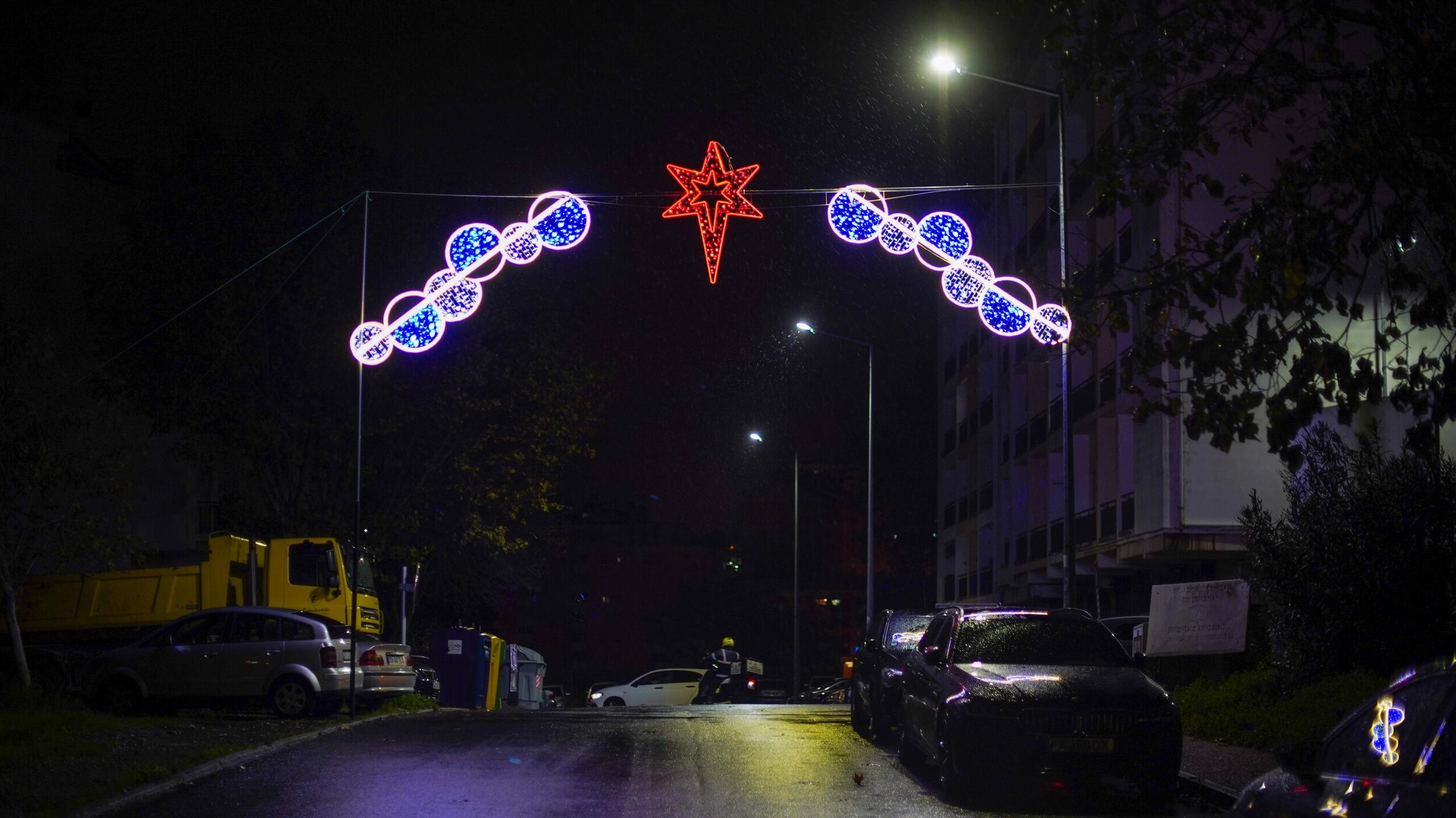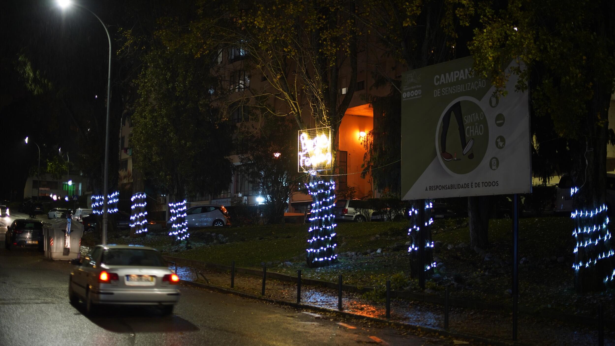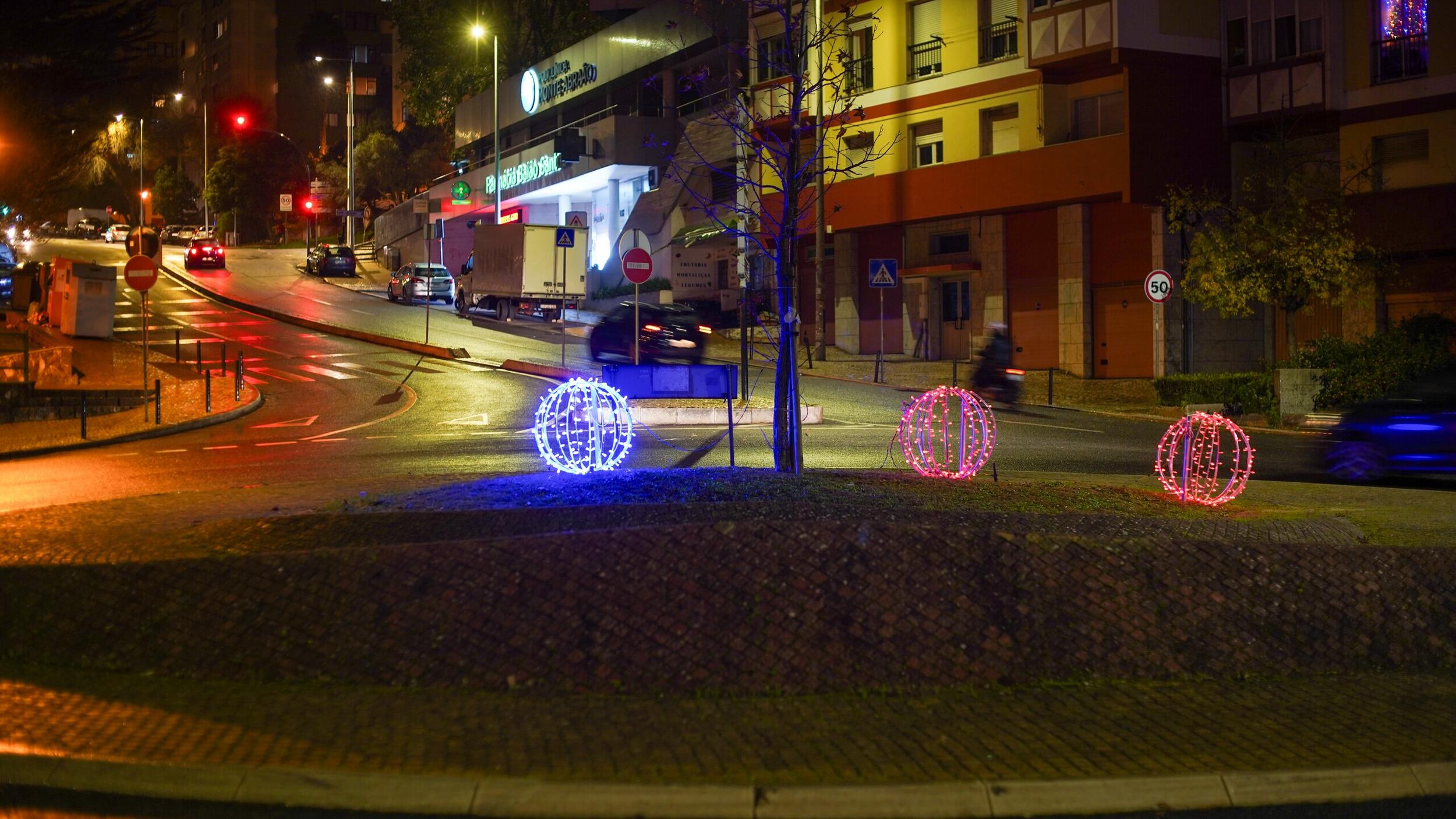 O destaque especial desta iluminação vai para a bola presente que está no acesso à Estufa da Quinta das Flores, em Massamá, e para o presente gigante no Parque 25 de Abril, em Monte Abraão.