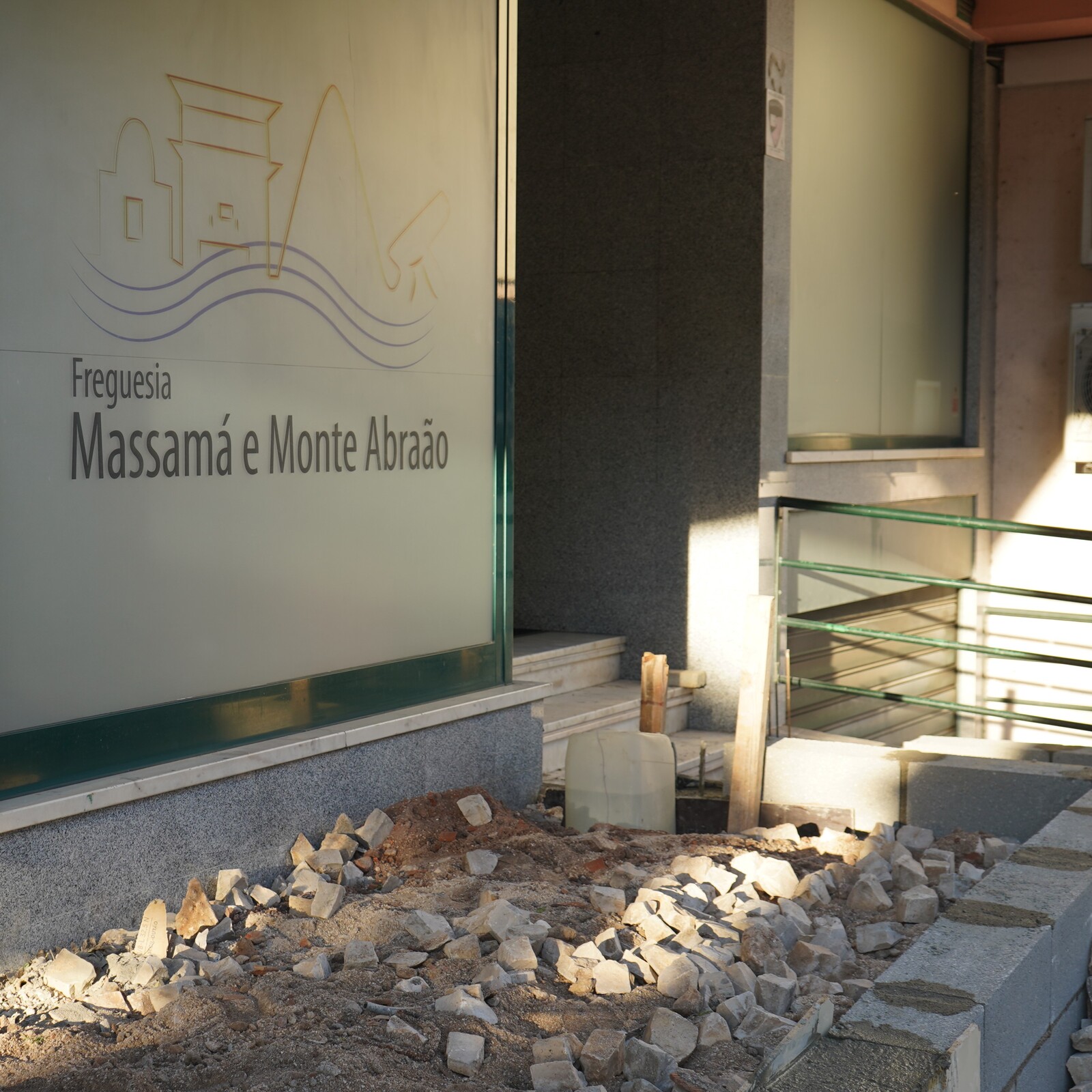 Devido à construção de uma rampa de acesso ao atendimento da junta de freguesia, nas instalações de Monte Abraão, o atendimento ao público realiza-se pela outra porta.