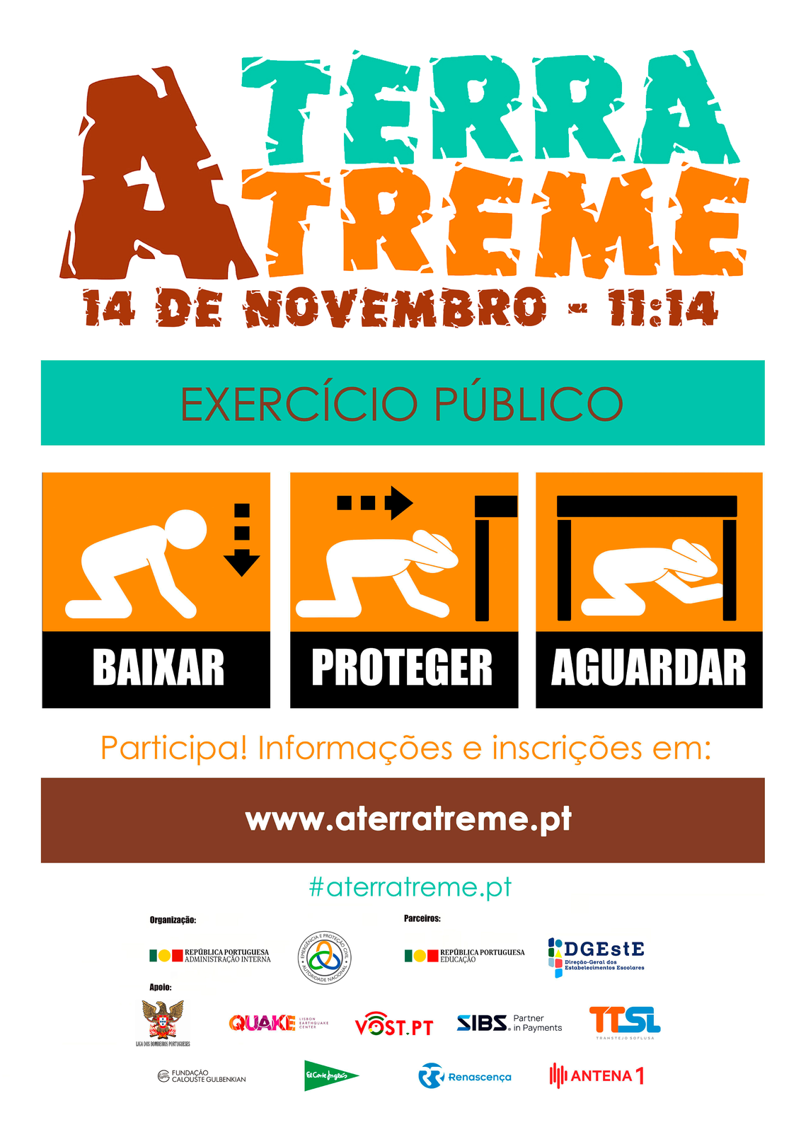 A ANEPC convida, assim, os cidadãos e instituições a inscreverem-se em www.aterratreme.pt e a participarem como demonstração do seu compromisso pessoal/institucional para com a causa da proteção e segurança, e como forma de apoio e expressão pública do seu envolvimento no Exercício A TERRA TREME.