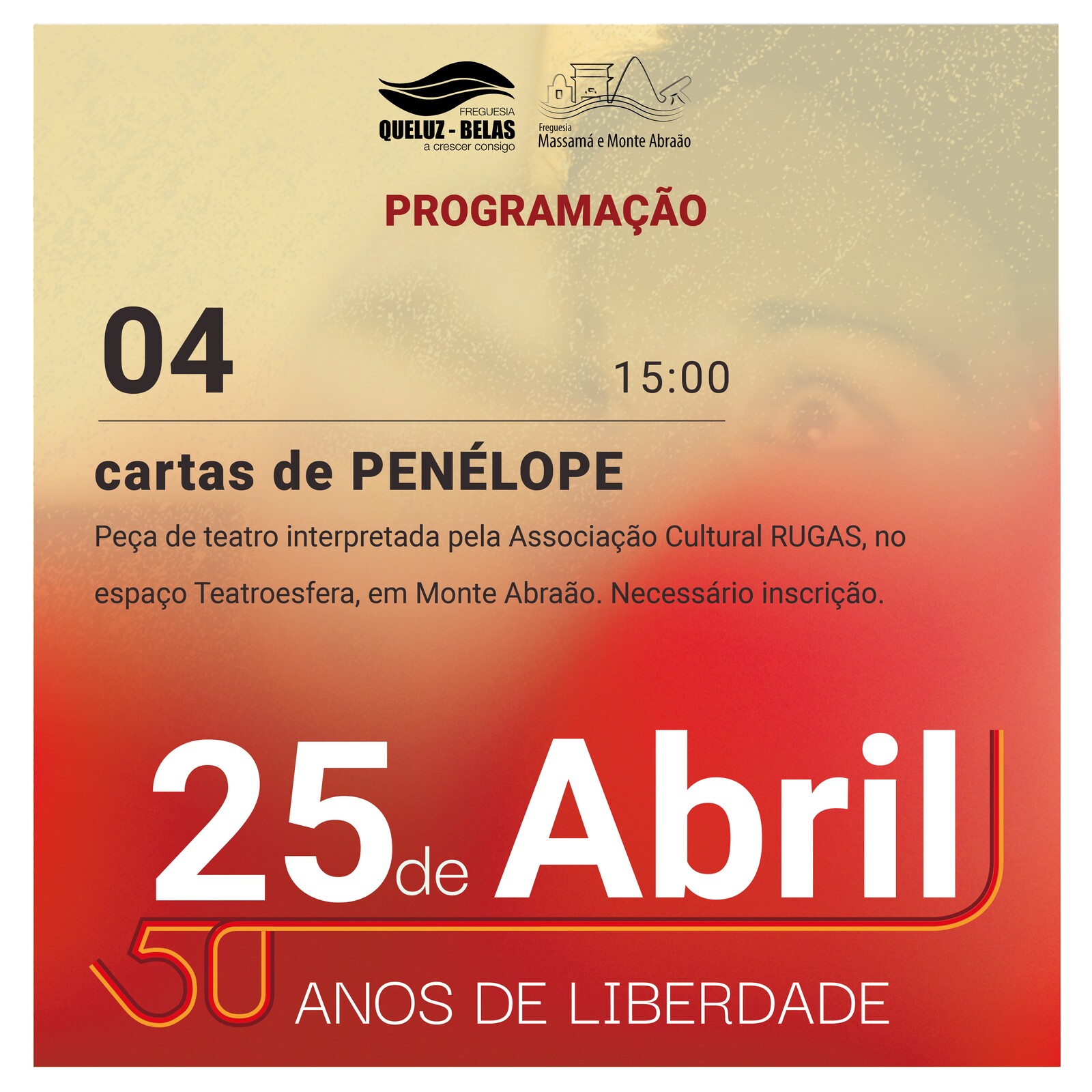 No âmbito das comemorações dos 50 anos do 25 de abril estão abertas as inscrições para a peça de Teatro "cartas de PENÉLOPE", com uma interpretação da Associação Cultural RUGAS, e acolhimento do espaço Teatroesfera, em Monte Abraão.