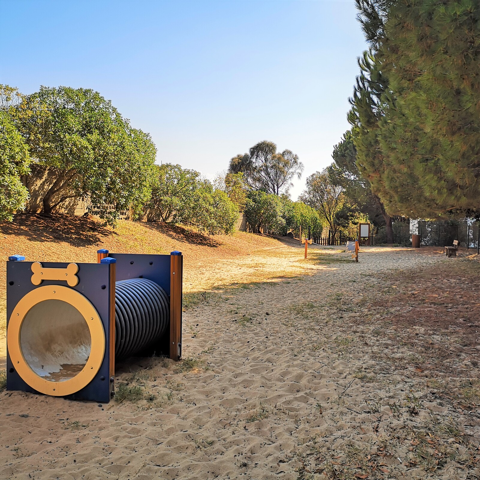 🐶 Traseiras da Rua Alexandre O’Neill – Massamá, este espaço conta com equipamentos de agilidade canina, banco e dispensador de dejetos caninos.