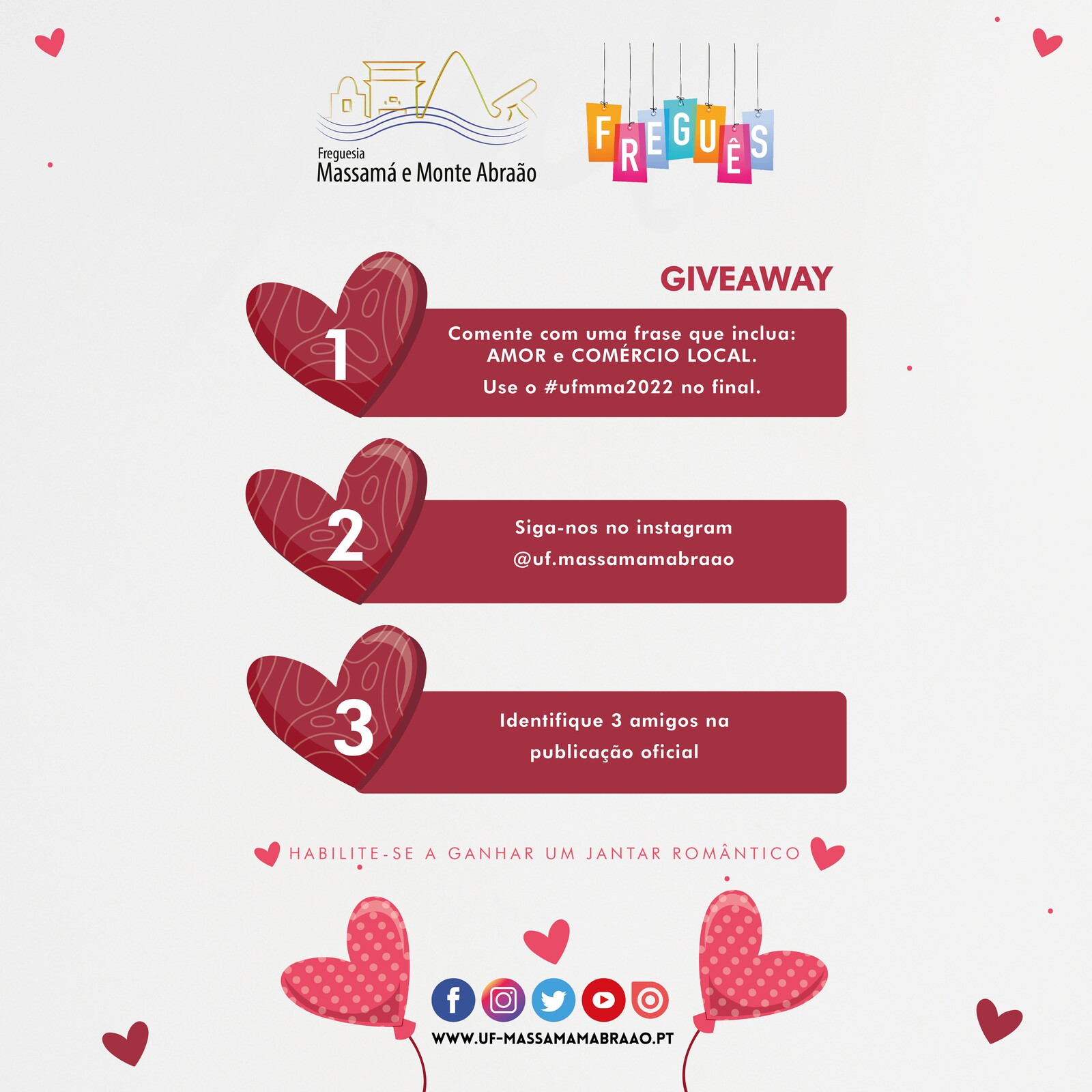 Neste sentido, a União das Freguesias de Massamá e Monte Abraão apresenta um Giveaway, cujo intuito é oferecer um jantar romântico para duas pessoas. Esta refeição poderá realizar-se num dos seguintes estabelecimentos aderentes à Rede Freguês: