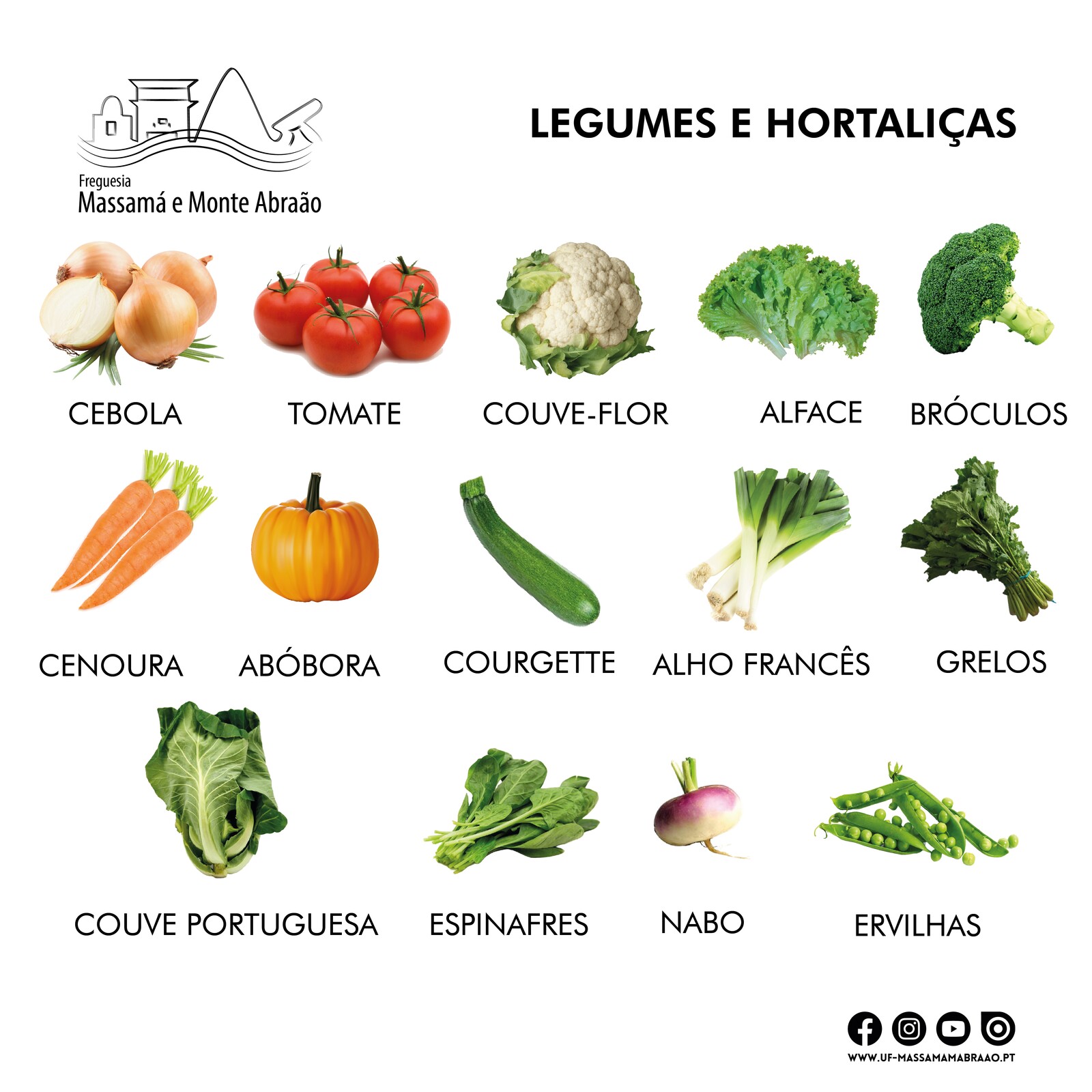 ➡️ Legumes e hortaliças como: cebola, tomate, couve-flor, alface, brócolos, cenoura, courgette, alho francês, abóbora, grelos, couve portuguesa, espinafres, nabo e ervilhas
