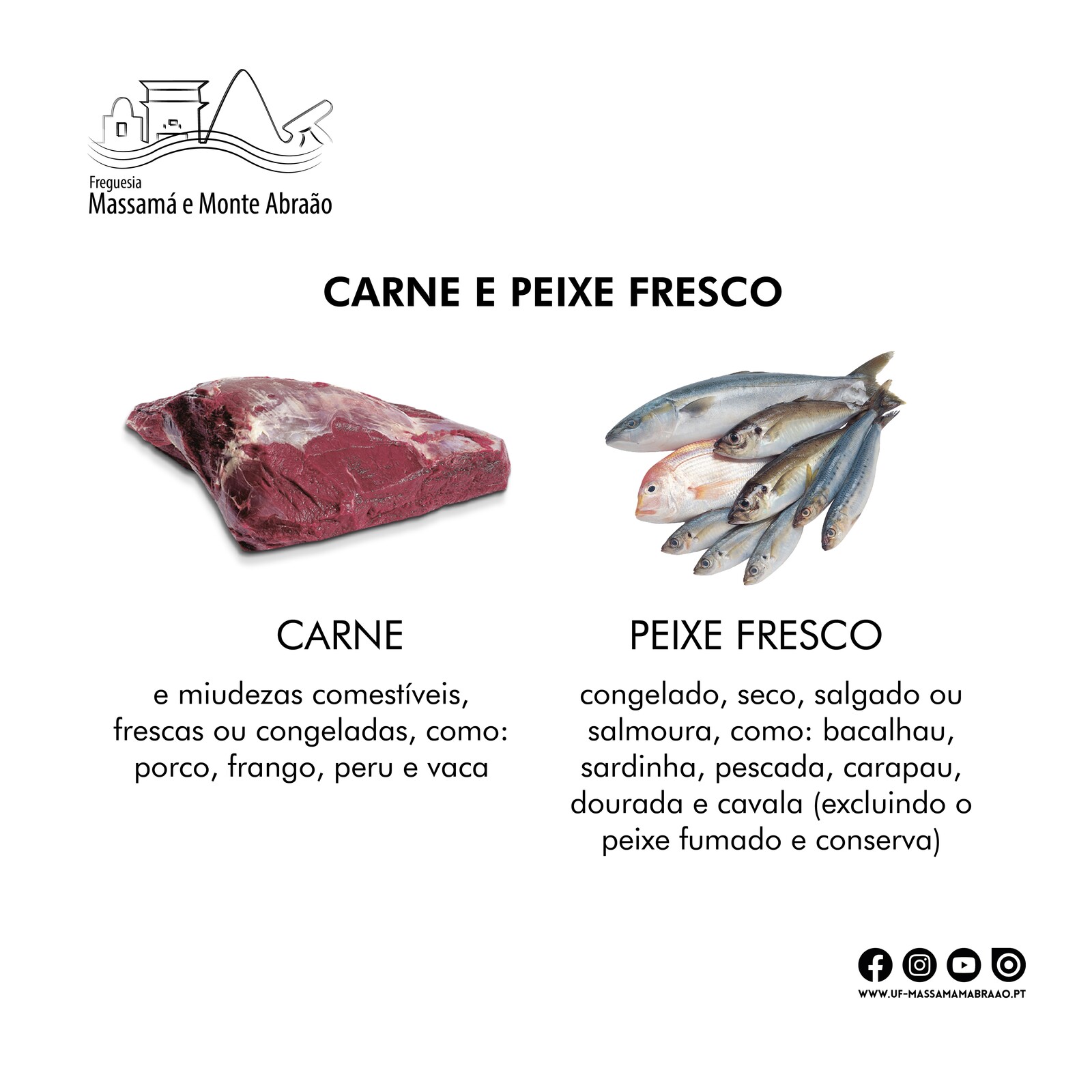 ➡️ Peixe fresco, congelado, seco, salgado ou salmoura, como: bacalhau, sardinha, pescada, carapau, dourada e cavala (excluindo o peixe fumado e conserva)
