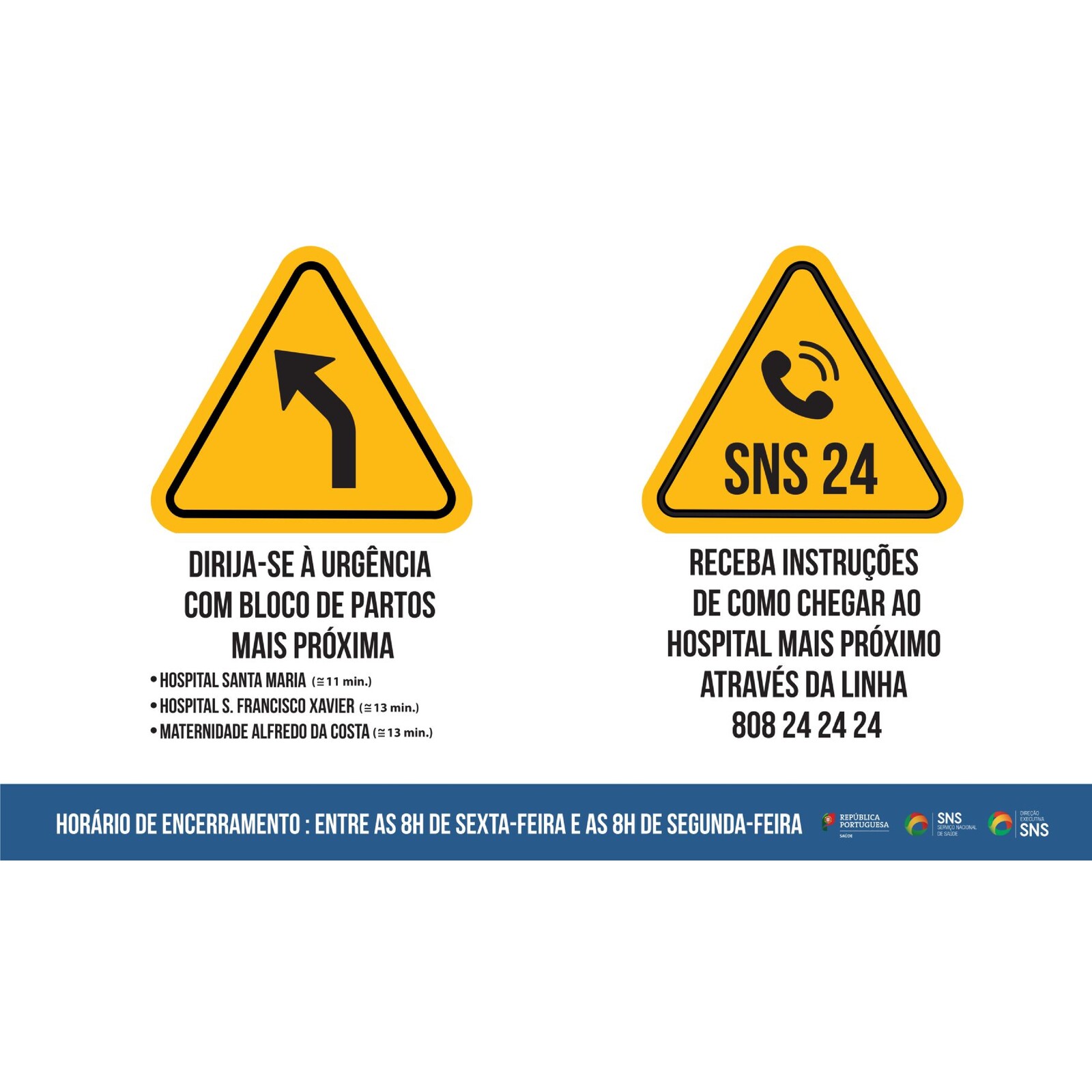 Mais se informa, que a partir de 1 de agosto, o bloco de partos do Centro Hospitalar de Lisboa Norte, E.P.E. (Hospital de Santa Maria) irá encerrar para obras, durante um período de 9-12 meses, sendo concentradas as equipas e a resposta no Centro Hospitalar de Lisboa Ocidental, E.P.E. (Hospital de S. Francisco Xavier). Assim, a partir de 1 de agosto este hospital passa a funcionar de forma ininterrupta 7 dias/semana.