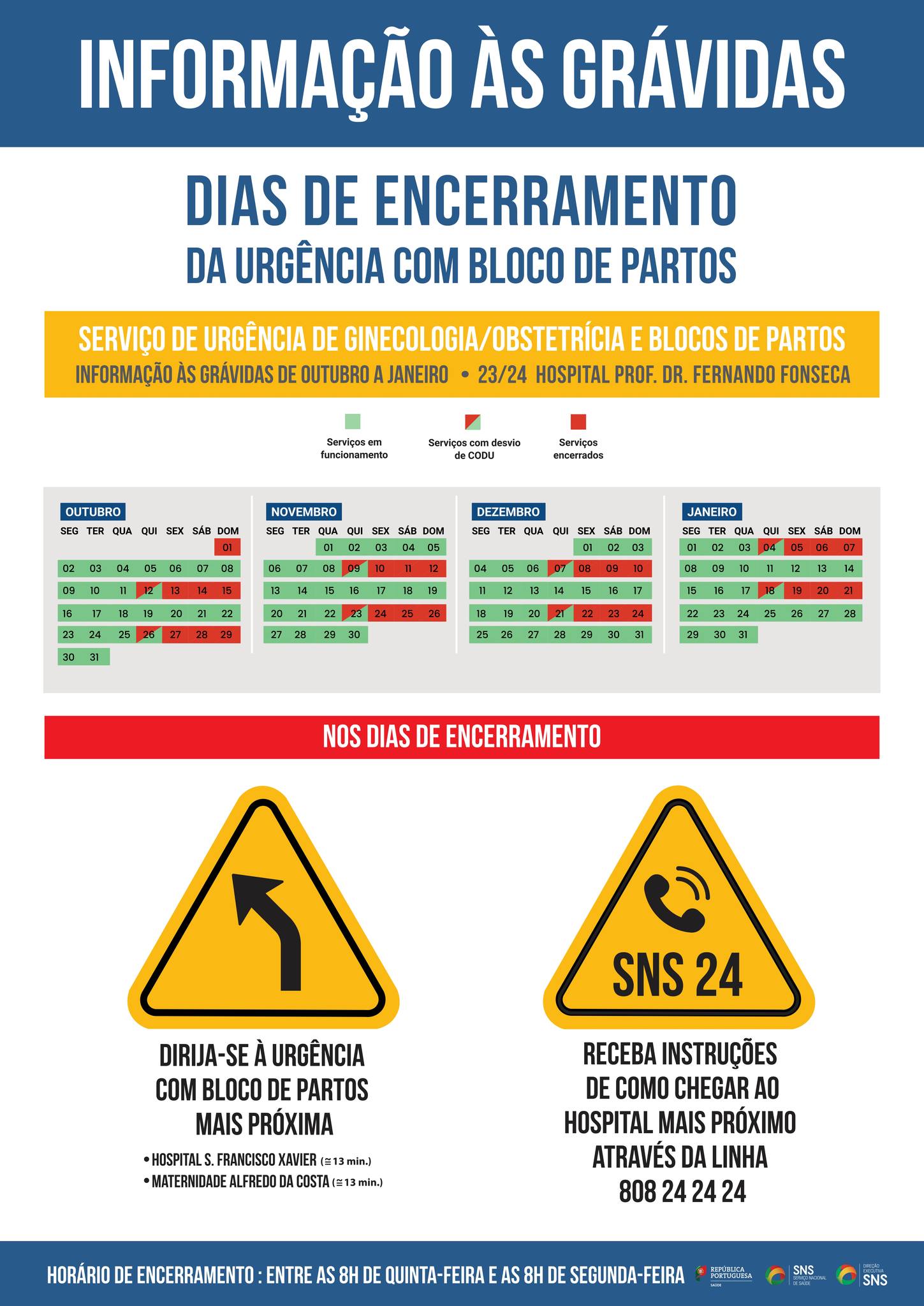 No âmbito da comunicação da Direção Executiva do Serviço Nacional de Saúde, de 2 de outubro de 2023 sobre a Operação Nascer em Segurança no Serviço Nacional de Saúde (SNS), o Hospital Professor Doutor Fernando Fonseca divulga a informação relativa ao Serviço de Urgência de Ginecologia e Obstetrícia, Bloco de Partos e Neonatologia no período do Inverno de 2023/2024.