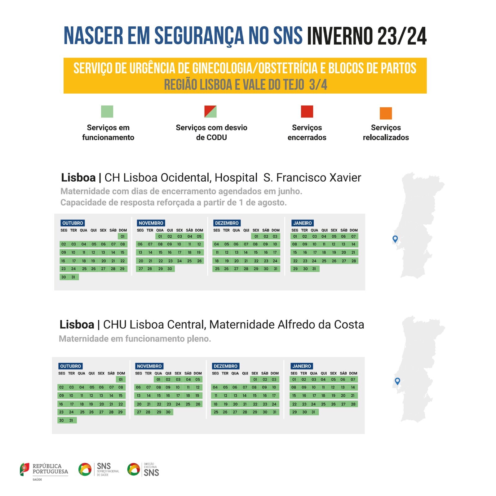 Mais se informa, que o bloco de partos do Centro Hospitalar de Lisboa Norte, E.P.E. (Hospital de Santa Maria) se encontra encerrado para obras, sendo concentrada a resposta no Centro Hospitalar de Lisboa Ocidental, E.P.E. (Hospital de S. Francisco Xavier). Assim, este hospital estará a funcionar de forma ininterrupta 7 dias/semana.