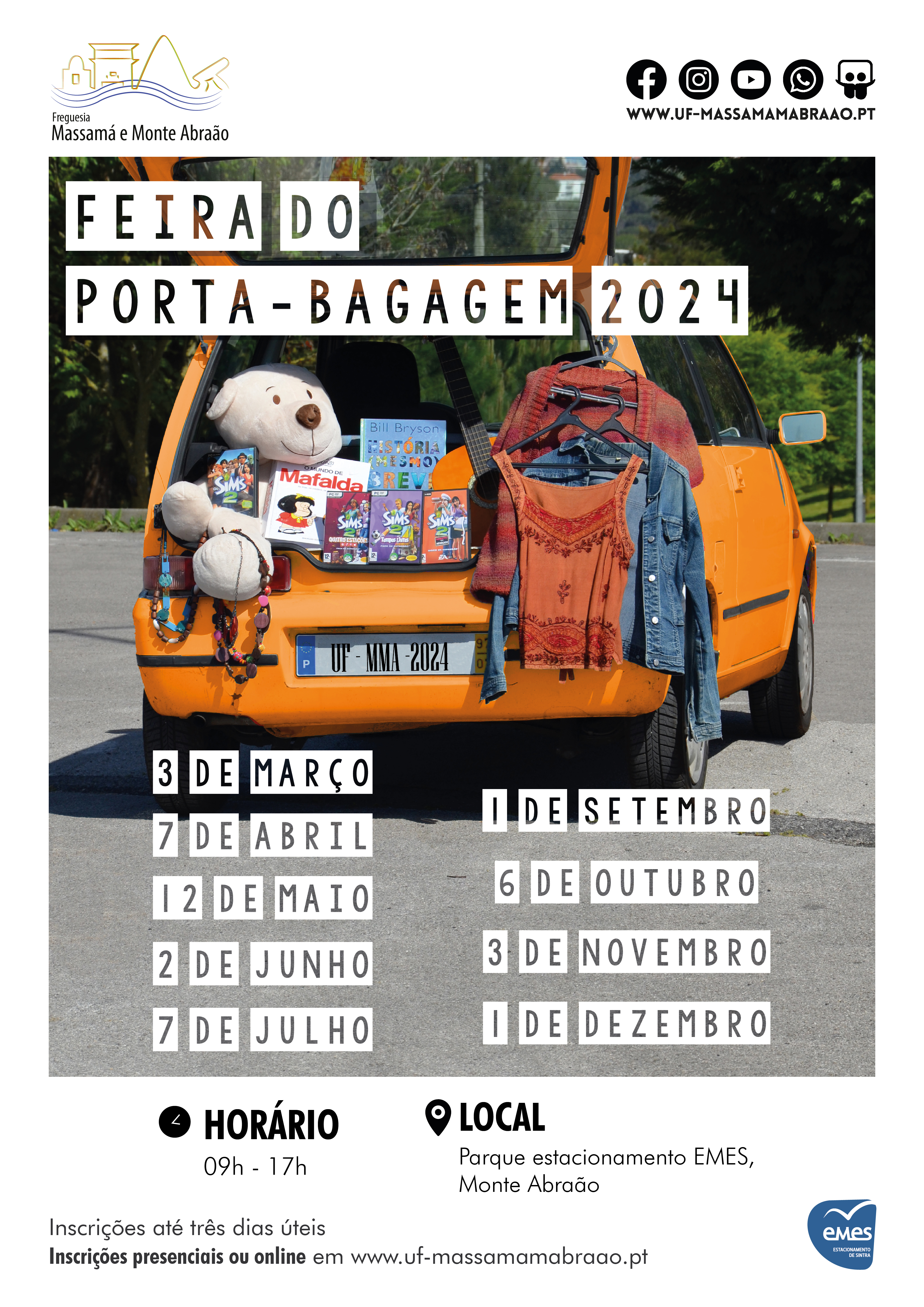 A próxima Feira do Porta-Bagagem decorre dia 2 de junho, no Parque de Estacionamento da EMES (frente à Escola Secundária Miguel Torga), em Monte Abraão.