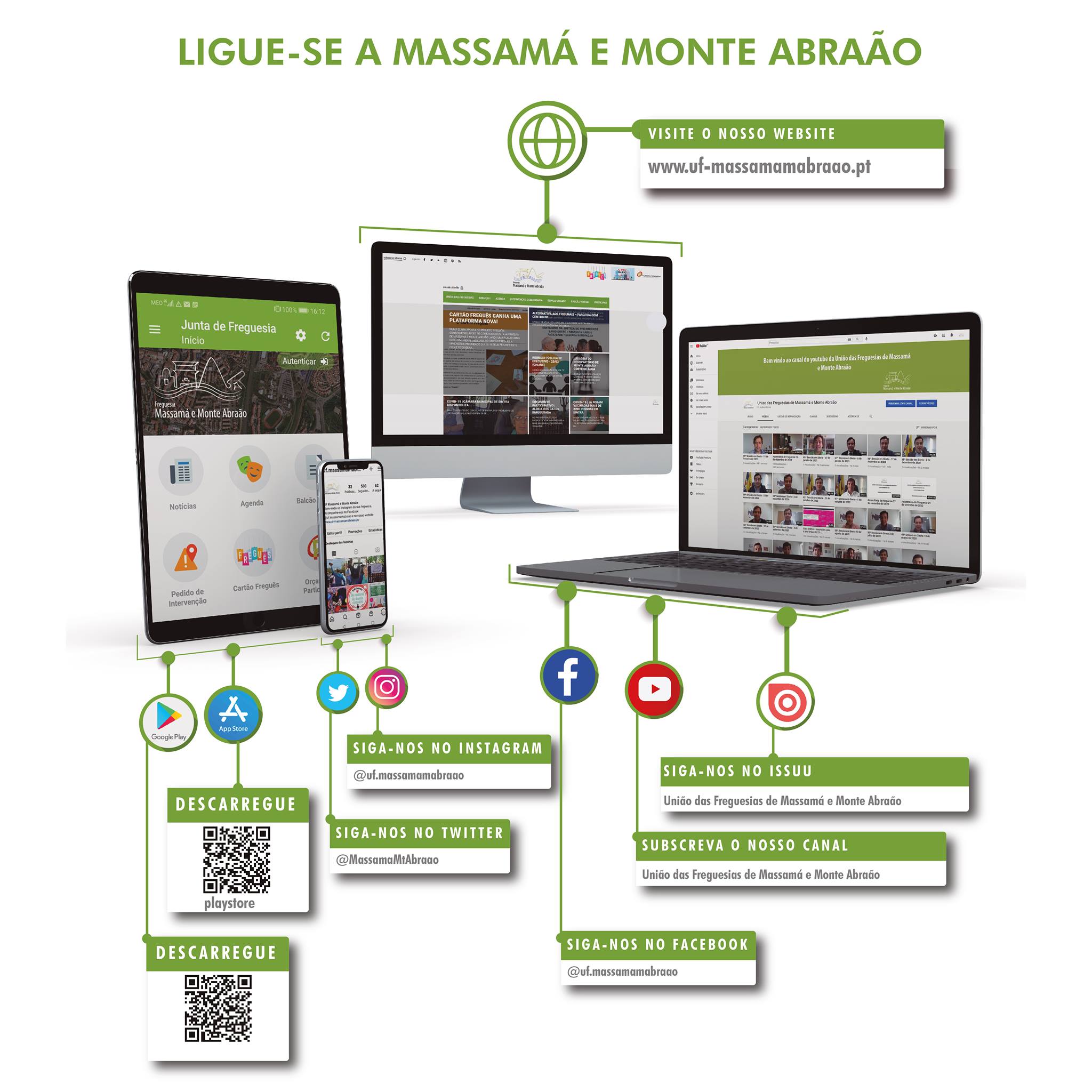 A União das Freguesias de Massamá e Monte Abraão também está presente na rede social Facebook e Instagram. Visite o nosso canal de youtube e entre em contacto connosco através do whatsapp.