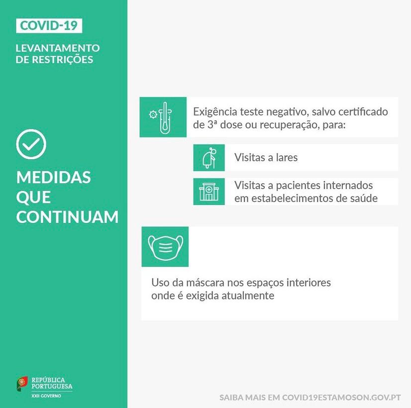 - A apresentação de teste negativo, salvo Certificado de 3.ª dose ou de Recuperação, nas visitas a lares e a pacientes internados em estabelecimentos de saúde