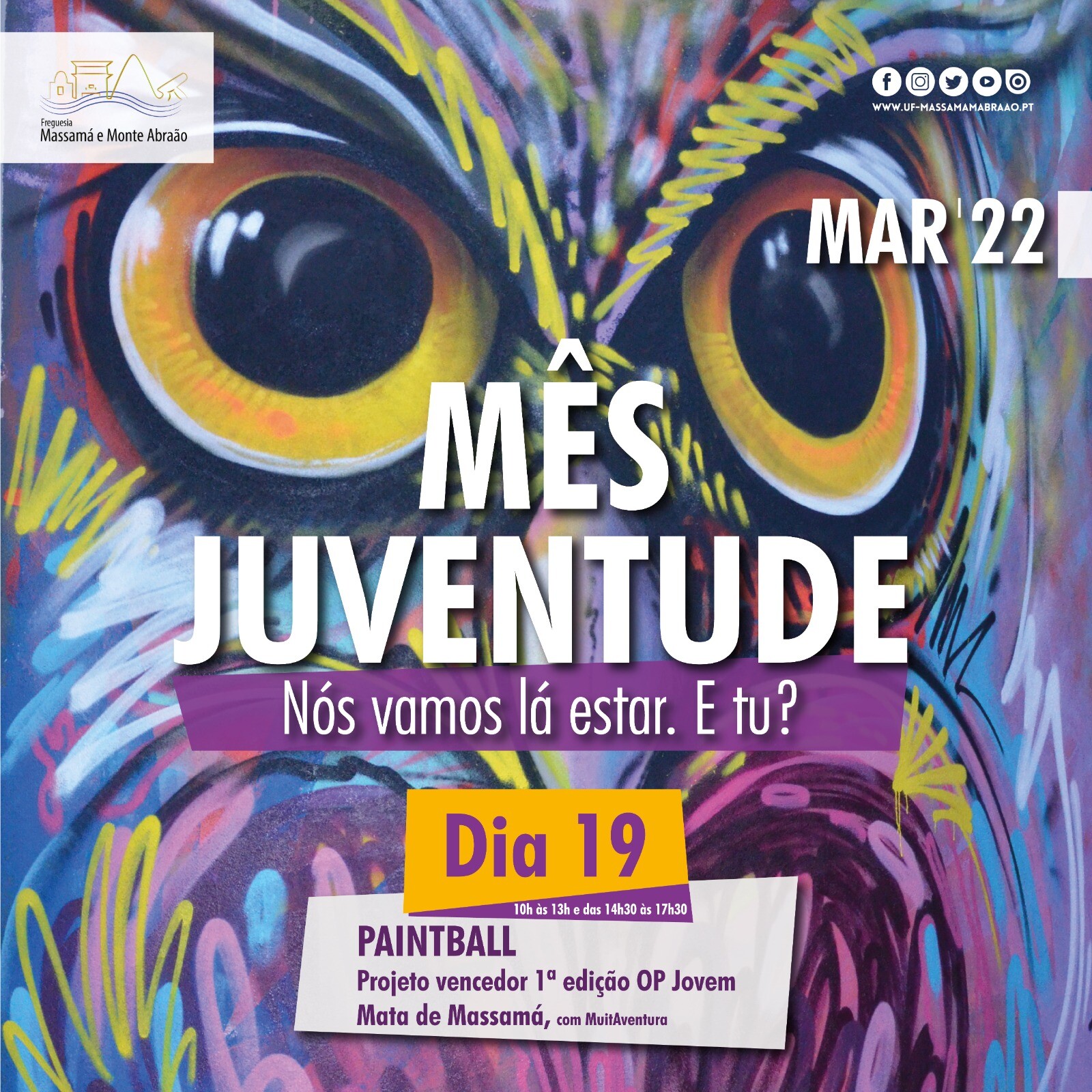 - Dia 19 de Março: realizar-se-á a atividade Paintball (um projeto vencedor da I edição do Orçamento Participativo Jovem), na Mata de Massamá, com a MuitAventura. Decorrerá no horário das 10h às 13h e das 14h30 às 17h30. Esta é uma atividade que carece de inscrição, a qual poderá ser efetuada AQUI.
