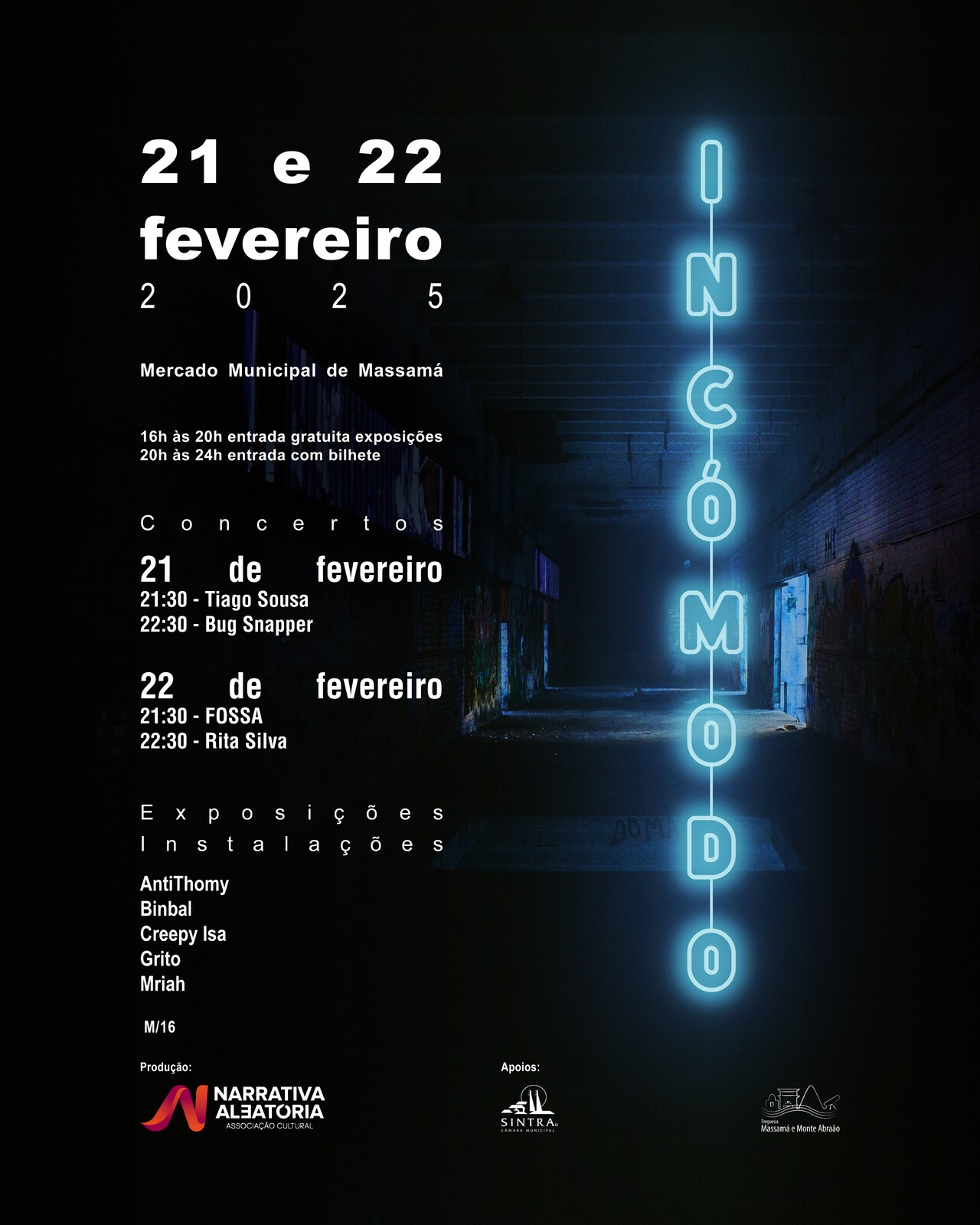 A Associação Cultural Narrativa Aleatória, promove um evento cultural com o apoio da Câmara Municipal de Sintra e da União das Freguesias de Massamá e Monte Abraão, que desafia o convencional intitulado por “INCÓMODO”. O evento que decorrerá de 21 a 22 de fevereiro, no espaço do Mercado Municipal de Massamá, em Sintra, promete desafiar as convenções artísticas e dar espaço a expressos criativas alternativas.