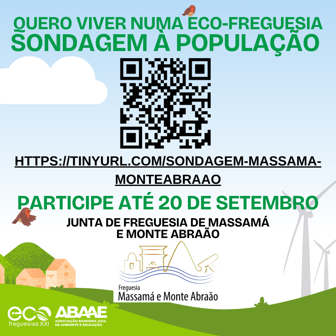 Neste sentido, até ao próximo dia 20 de setembro, está a decorrer uma sondagem a todos os cidadãos que residam em Massamá e Monte Abraão e tenham mais de 18 anos, e visa solicitar a opinião da comunidade, identificar situações que carecem de intervenção na Freguesia, e ainda reunir propostas de melhorias na Freguesia nomeadamente nas áreas de: