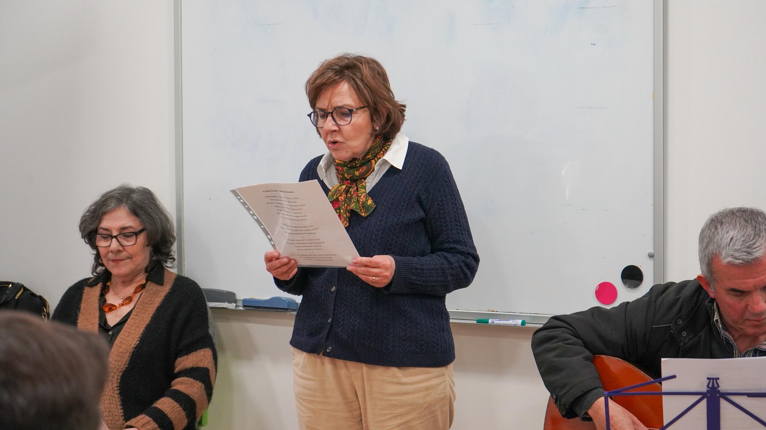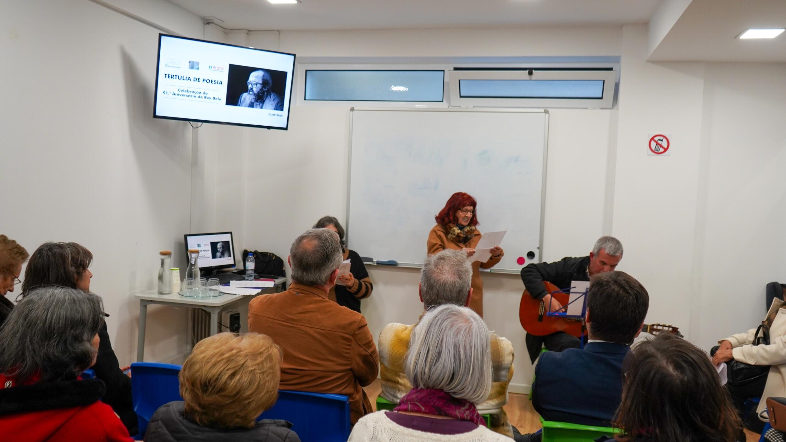 Ana Matias conduziu o evento, destacando a obra de Ruy Belo, enquanto José Baião proporcionou o acompanhamento musical. A tertúlia foi conduzida pela emoção e reverência à contribuição do poeta para a literatura portuguesa. Os participantes citaram as palavras do Ruy Belo, refletindo sobre sua obra e sensibilidade poética.