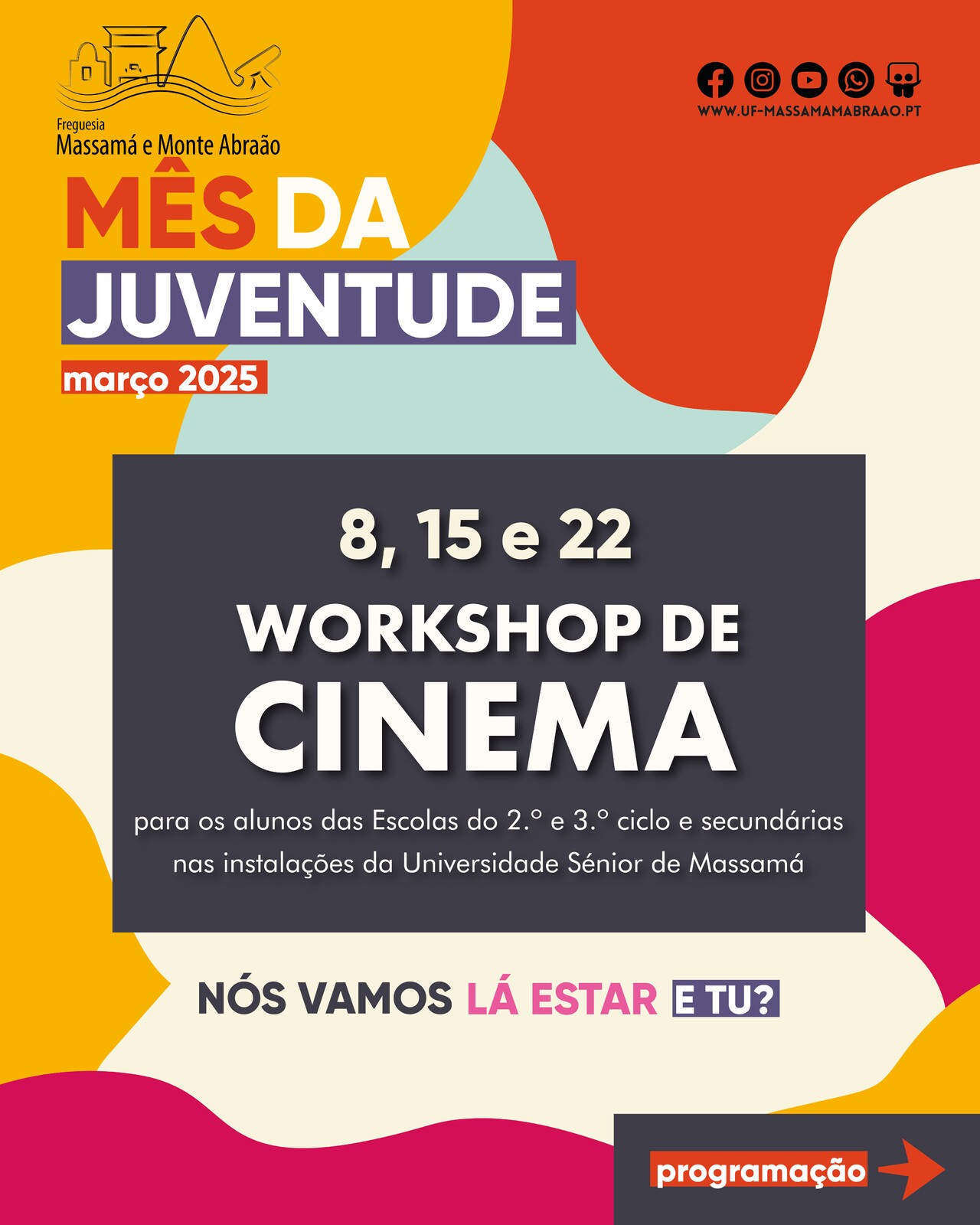 Nos dias 8, 15 e 22 de março, irão decorrer os Workshops de Cinema, nas instalações da Universidade Sénior de Massamá, com inscrições abertas online entre 25 de fevereiro e 5 de março AQUI. Fruto de duas propostas vencedoras do Orçamento Participativo Jovem (3.ª e 5.ª edições), estes workshops visam ensinar os participantes a utilizar equipamentos de cinema, como câmaras de filmar, computadores e programas de edição de vídeo, culminando na criação de uma curta-metragem. A atividade é gratuita e conta com 30 vagas disponíveis, dirigindo-se a jovens do 5.º ao 12.º anodas escolas da freguesia. O filme produzido será exibido na Sessão de Cinema ao Ar Livre, no dia 28 de março, às 21h00, no espaço exterior do Centro Lúdico de Massamá. A iniciativa é realizada com a colaboração das associações culturais Claraboia e Narrativa Aleatória.