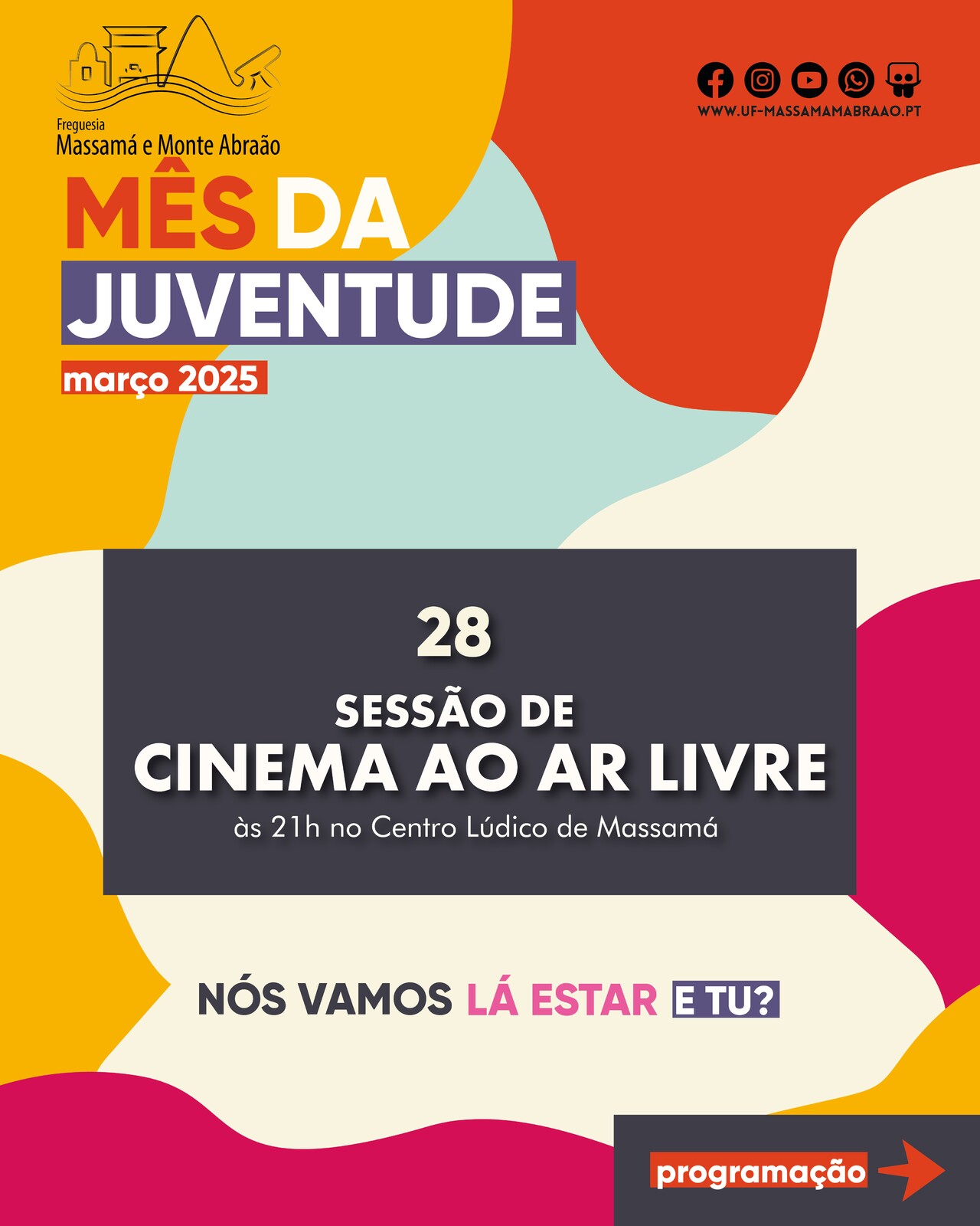 No dia 28 de março, realizar-se-á a Sessão de Cinema ao Ar Livre, onde será exibida a curta-metragem realizada entre 8 e 22 de março, no âmbito das comemorações do Mês da Juventude. O evento terá lugar às 21h00, no espaço exterior do Centro Lúdico de Massamá. Para além deste filme, serão exibidas outras curtas-metragens previamente visualizadas e selecionadas pelos alunos em cada uma das escolas. A entrada é livre e não requer inscrição.