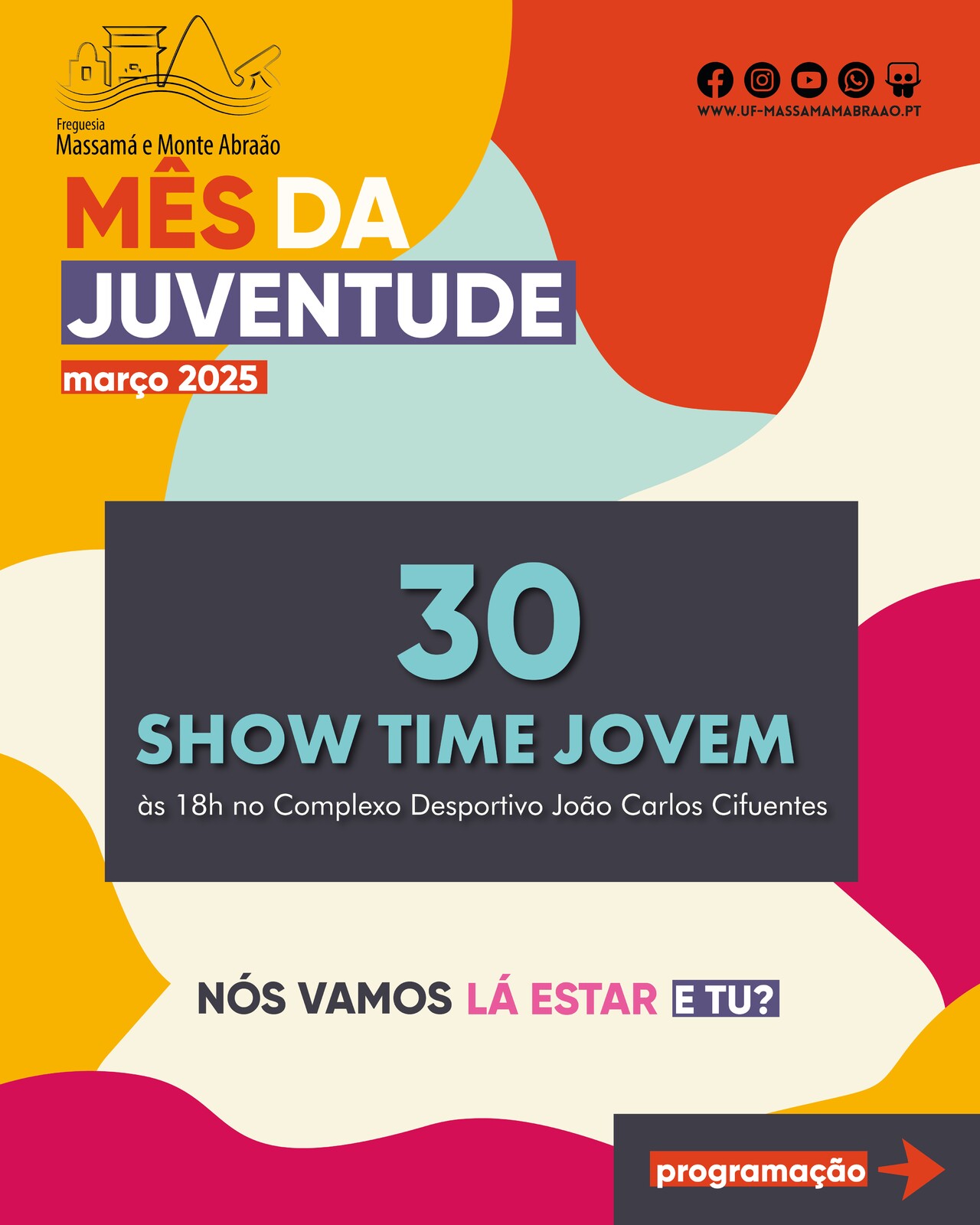 O Show Time Jovem terá lugar no dia 30 de março, às 18h00, no Complexo Desportivo João Carlos Cifuentes, em Monte Abraão. Este espetáculo tradicional reúne clubes e associações desportivas do concelho de Sintra para uma apresentação vibrante de modalidades desportivas, danças, ginástica acrobática e outras performances, e contará também com a participação e classes de escolas convidadas. O evento pretende celebrar a paixão e o talento dos jovens do concelho. As portas do pavilhão abrem às 17h00 e a entrada é gratuita.
