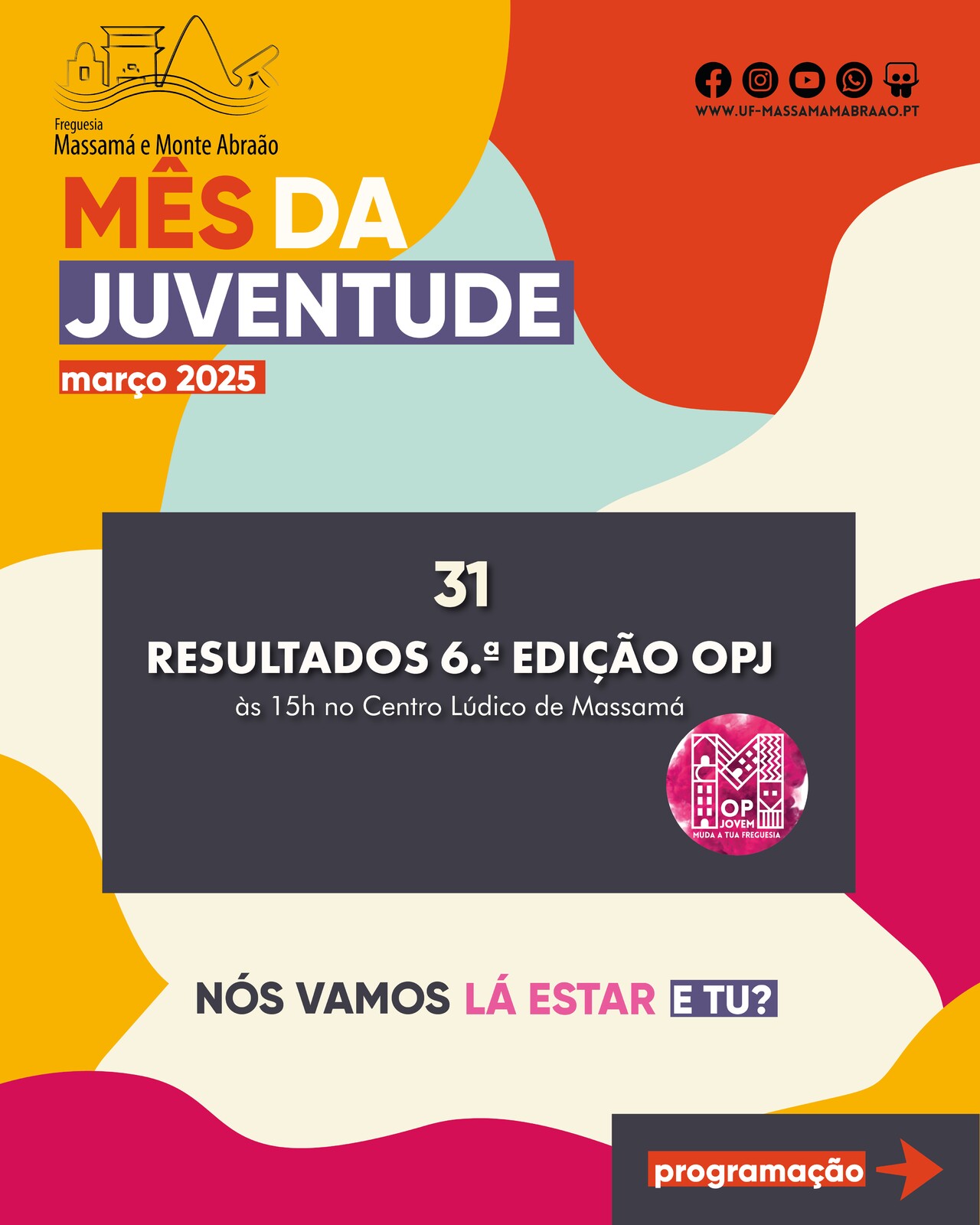 No dia 31 de março, decorrerá a Apresentação dos Resultados da 6.ª edição do Orçamento Participativo Jovem, onde serão destacadas as iniciativas e projetos escolhidos pelos jovens, contribuindo para o desenvolvimento das comunidades escolares e da freguesia. A sessão terá lugar no Centro Lúdico de Massamá, às 15h00, com entrada gratuita e sem necessidade de inscrição.