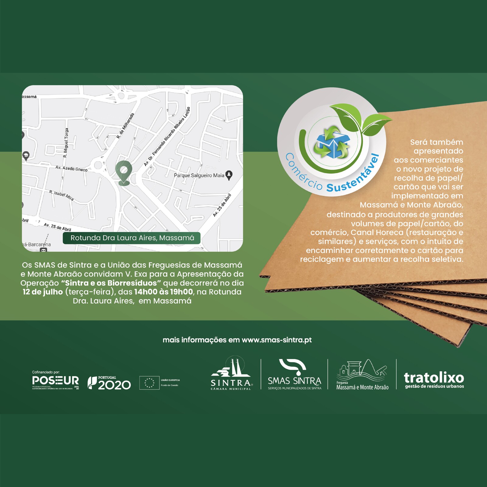 No dia 12 de julho pelas 14h00 decorrerá, na Rotunda Dra. Laura Aires, em Massamá, a operação “Sintra e os Biorresíduos” realizada pelos Serviços Municipalizados de Águas e Saneamento de Sintra.