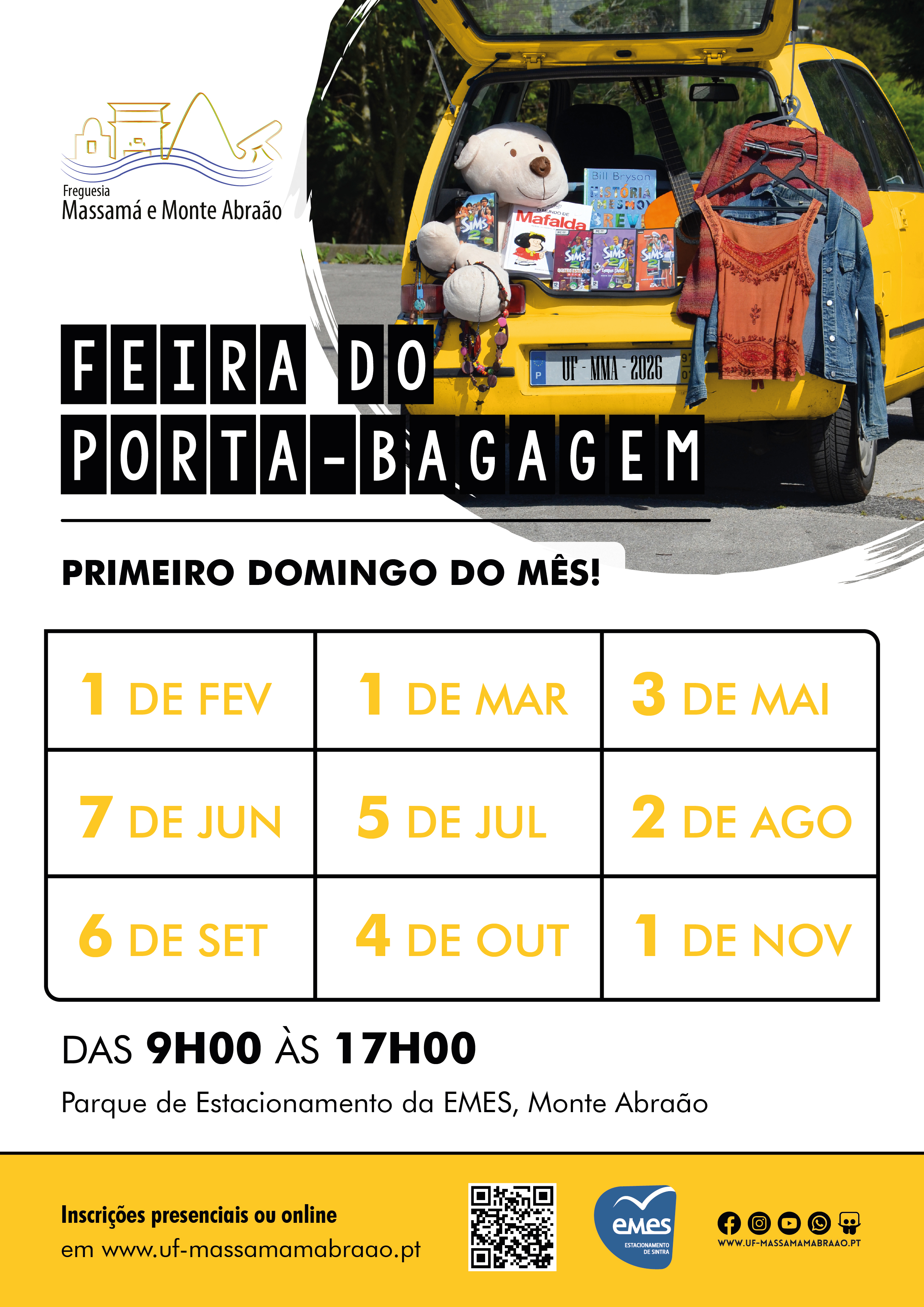 Estão abertas as inscrições para a Feira do Porta-Bagagem, que decorrerá dia 3 de maio, no Parque de Estacionamento da EMES (frente à Escola Secundária Miguel Torga), em Monte Abraão. Faça parte desta iniciativa que promove a reutilização e a redução do desperdício!