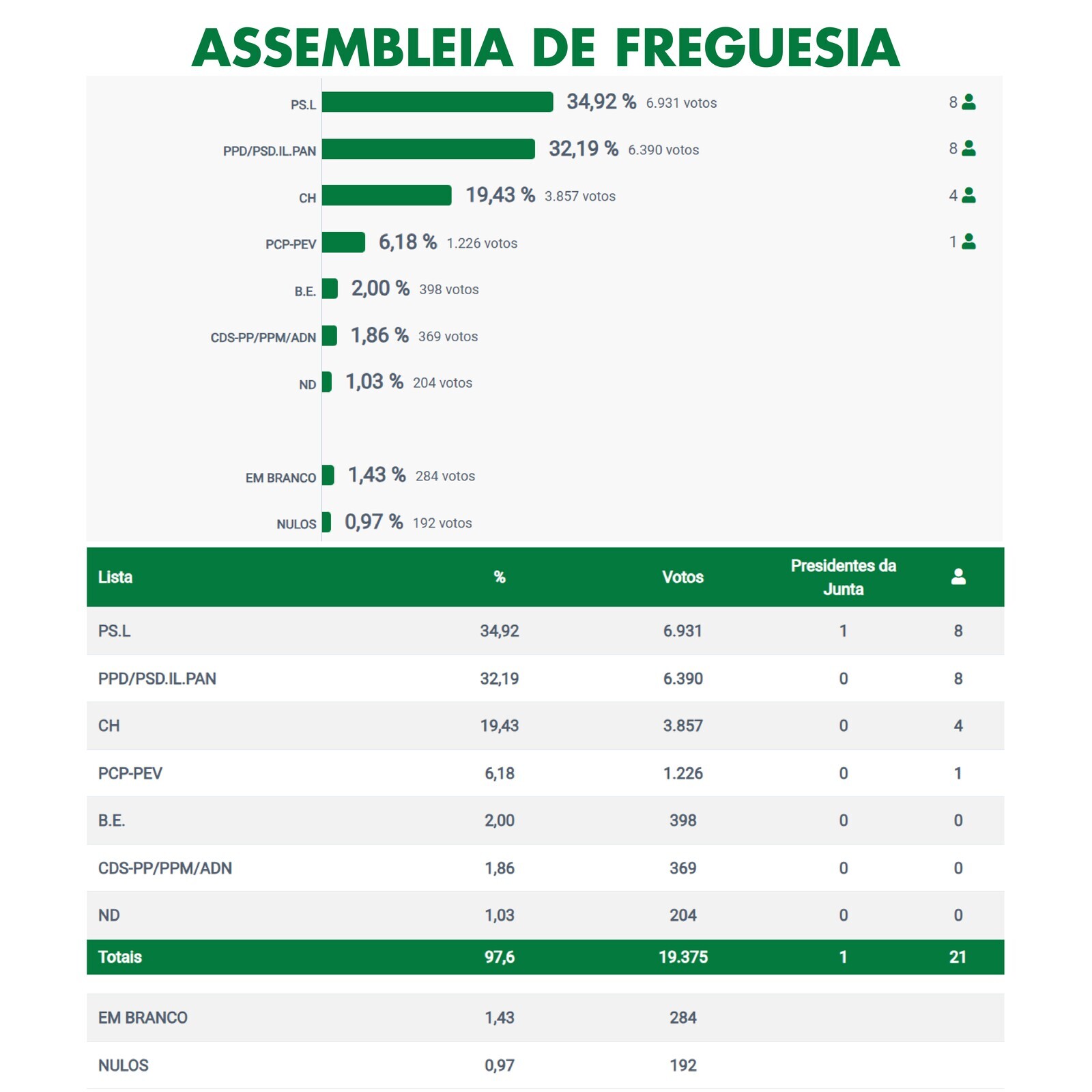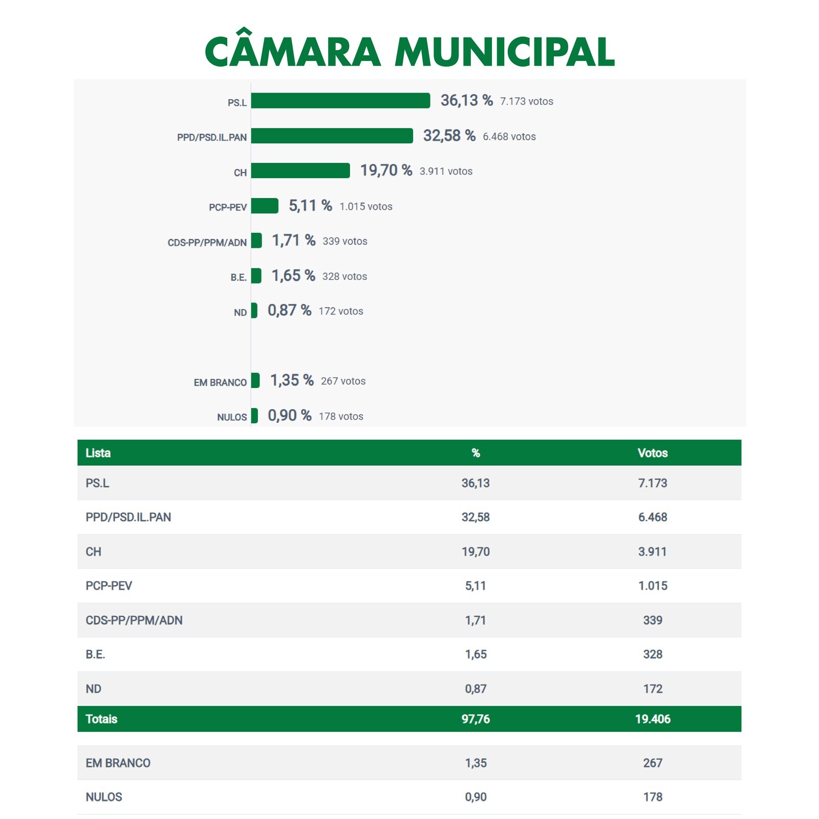 - CHEGA – 19,43%, correspondentes a 3.857 votos, com 4 mandatos