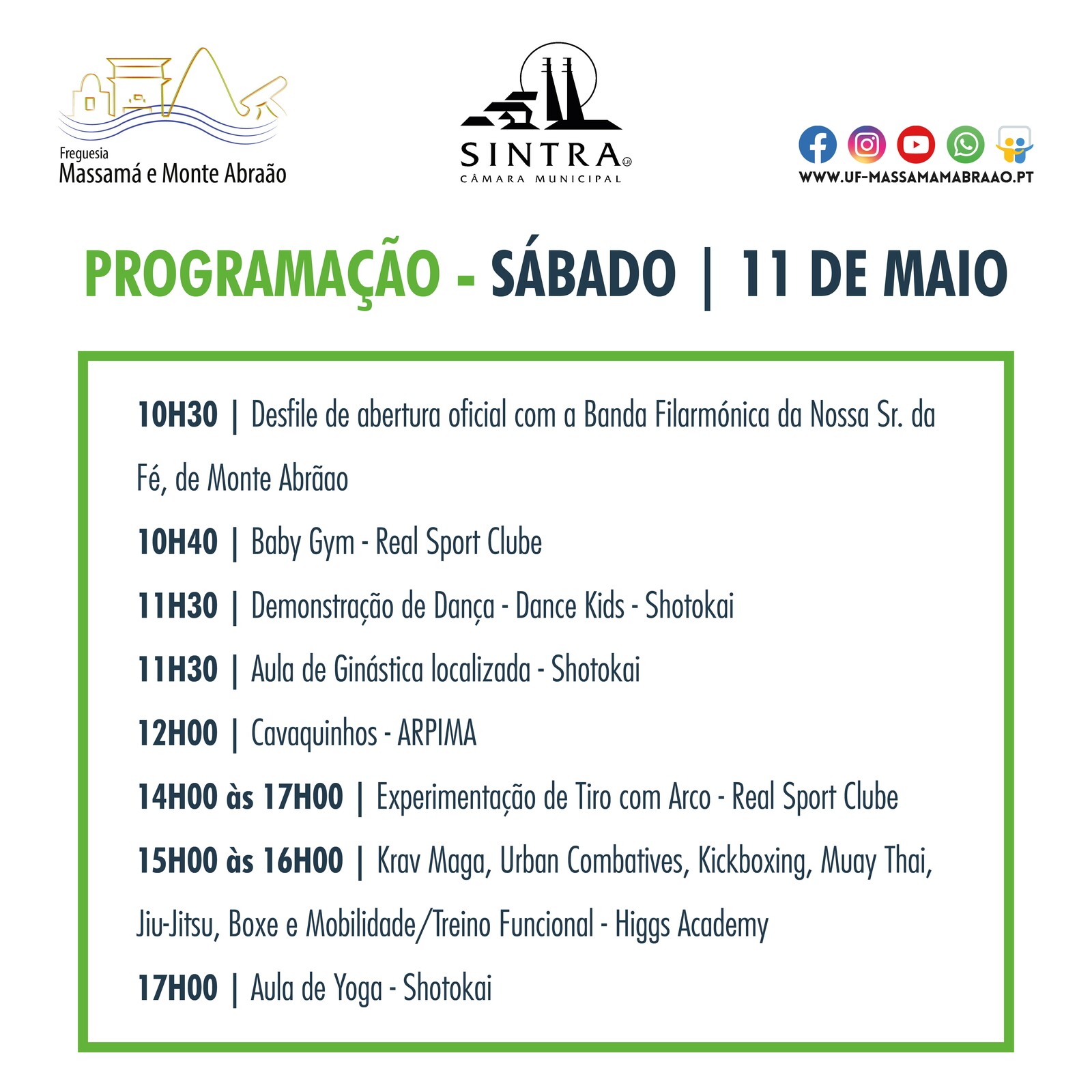 - 10H30: Desfile de abertura oficial com a participação da Banda Filarmónica da Nossa Senhora da Fé, de Monte Abraão